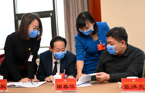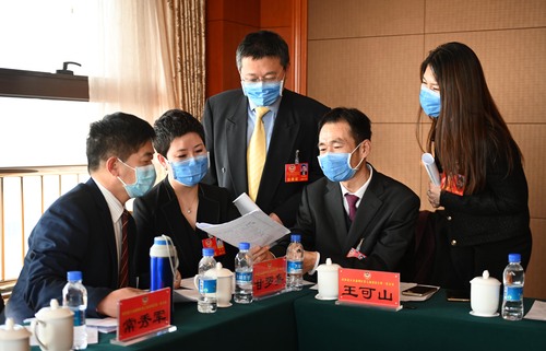 圖為農(nóng)工致公界分組討論會間隙,委員們就熱點話題繼續(xù)進行討論。