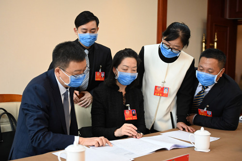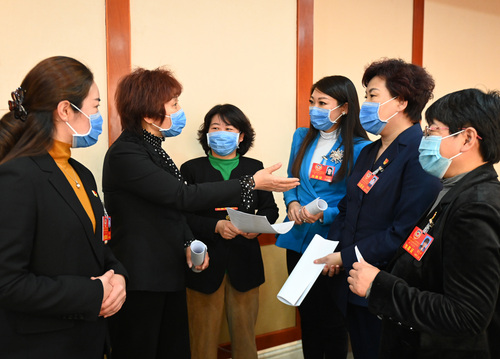 圖為婦聯(lián)界分組討論會間隙,委員們就熱點話題繼續(xù)進行討論。
