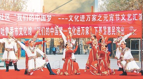 “火紅的燈籠掛起來(lái),熱鬧的燈謎猜起來(lái),甜蜜的元宵吃起來(lái)。”2月14日元宵節(jié)前夕,新疆維吾爾自治區(qū)吐魯番市高昌區(qū)政協(xié)“訪(fǎng)惠聚”駐廣匯社區(qū)工作隊(duì)組織轄區(qū)群眾開(kāi)展“我們的中國(guó)夢(mèng)”文化進(jìn)萬(wàn)家之元宵節(jié)文藝演出活動(dòng),共迎元宵佳節(jié)。 壽偉 攝
