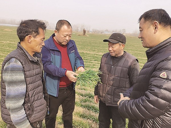 近日,山東省菏澤市牡丹區(qū)政協(xié)組織委員來到田間地頭,實地查看土地墑情和小麥生長情況。為群眾講解當(dāng)下麥田管理的良方,給農(nóng)民送來了金點子。圖為區(qū)政協(xié)委員、高級農(nóng)藝師付志偉(左二)在給農(nóng)民講解防蟲害知識。王文 姜維 攝
