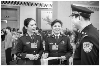 3月5日,十三屆全國(guó)人大五次會(huì)議開(kāi)幕前,全國(guó)人大代表、新疆維吾爾自治區(qū)烏魯木齊市公安局民警趙金龍(右)恰好遇到同是來(lái)自公安系統(tǒng)的全國(guó)人大代表,陜西省西安市公安局蓮湖分局勞動(dòng)南路派出所民航社區(qū)民警郝世玲(中)、黑龍江省齊齊哈爾市公安局禁毒支隊(duì)三級(jí)高級(jí)警長(zhǎng)魏春(左),三人在一起交談此次各自帶來(lái)的議案和建議?! ?nbsp; 本報(bào)記者 王建軍 攝