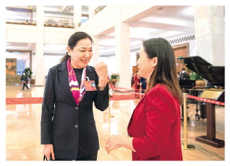 ▲ 全國人大代表、中華全國律師協(xié)會副會長李亞蘭(左)與全國人大代表、廣東百浩律師事務(wù)所主任黎霞交流履職感受。 本報(bào)記者 王建軍 攝