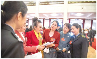 ▲ 全國人大代表、陜西省律師協(xié)會副會長方燕(右三)與女代表們就如何保障婦女兒童合法權(quán)益進(jìn)行交流。 本報(bào)記者 王建軍 攝