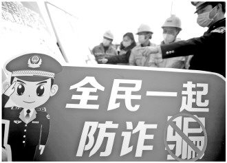 3月1日,在江蘇省儀征市一家造船廠,揚(yáng)州出入境邊防檢查站和人民銀行儀征市支行的志愿者向工人們講解防范電信網(wǎng)絡(luò)詐騙知識。 CFP供圖