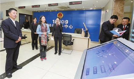 江蘇省徐州市檢察院邀請(qǐng)代表委員參加“走進(jìn)12309,檢察服務(wù)新體驗(yàn)”活動(dòng),圖為李甦雁(左三)參觀12309檢察服務(wù)中心。