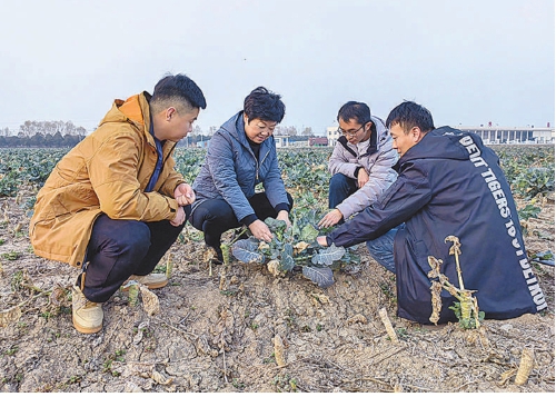 秦光蔚(左二)帶領(lǐng)科技人員到江蘇省響水縣南河鄉(xiāng)實(shí)地查看西蘭花生產(chǎn)過程中亟待解決的技術(shù)問題