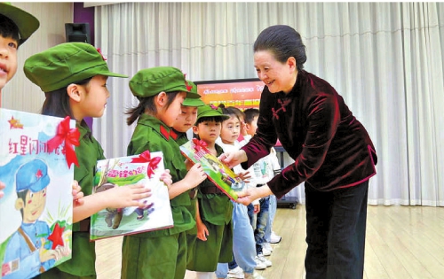 郭建華走進(jìn)開封市金明幼兒園,向孩子們贈送圖書。