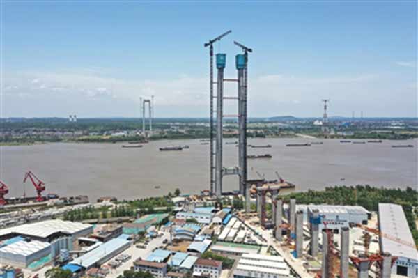 正在建設中的龍?zhí)堕L江大橋位于南京長江四橋與潤揚長江大橋之間,北接揚州儀征市,南接南京市、鎮(zhèn)江句容市,雙向六車道,設計時速100公里,全長4925米。新華社記者 楊磊 攝