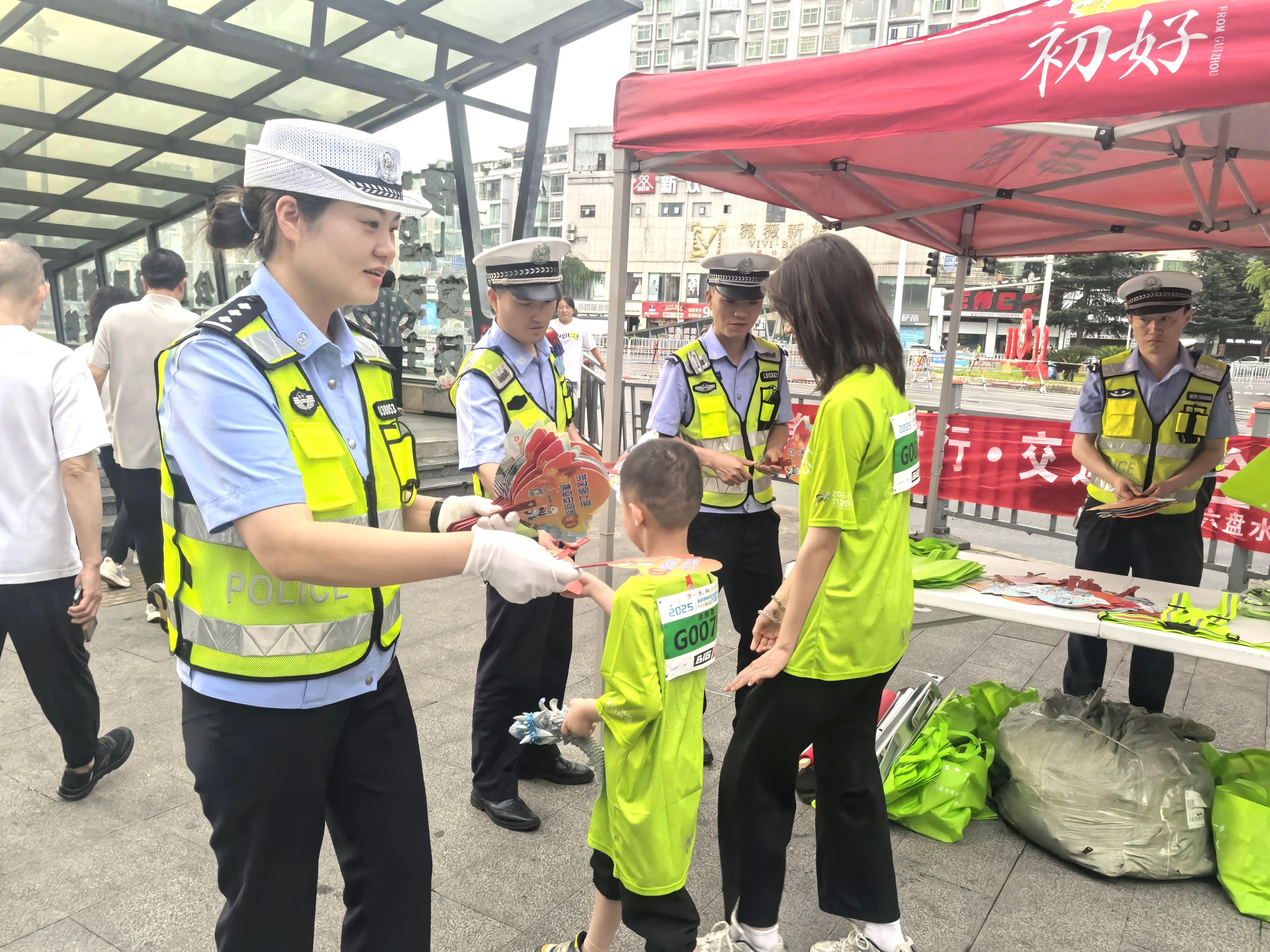 “被看見才安全”——暖心發(fā)放反光安全帶針對參賽者的特點,六盤水交警創(chuàng)新服務(wù)舉措,在活動現(xiàn)場設(shè)置宣傳服務(wù)臺向游客、群眾免費發(fā)放反光安全帶、小扇子,并現(xiàn)場講解夜間出行安全知識,提醒大家“被看見才安全”,有效提升夜間出行安全系數(shù)。