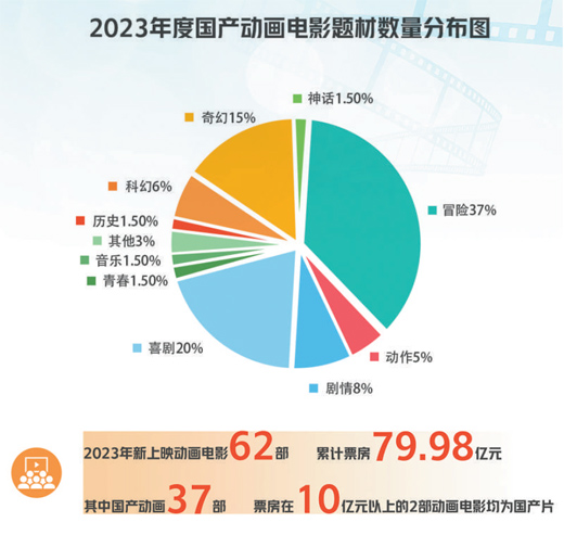 現(xiàn)實和預期,給了動畫人開拓事業(yè)的底氣。據不完全統(tǒng)計,2013年,上映33部動畫電影,總票房為16.4億元,國產動畫占比為38%。2023年新上映動畫電影62部,累計票房79.98億元,其中,國產動畫37部(含港澳臺);票房在10億元以上的2部動畫電影均為國產片。無論作品數量還是票房表現(xiàn),國產動畫電影都樹立了自己的“主場優(yōu)勢”,也在觀眾中贏得信任與口碑。