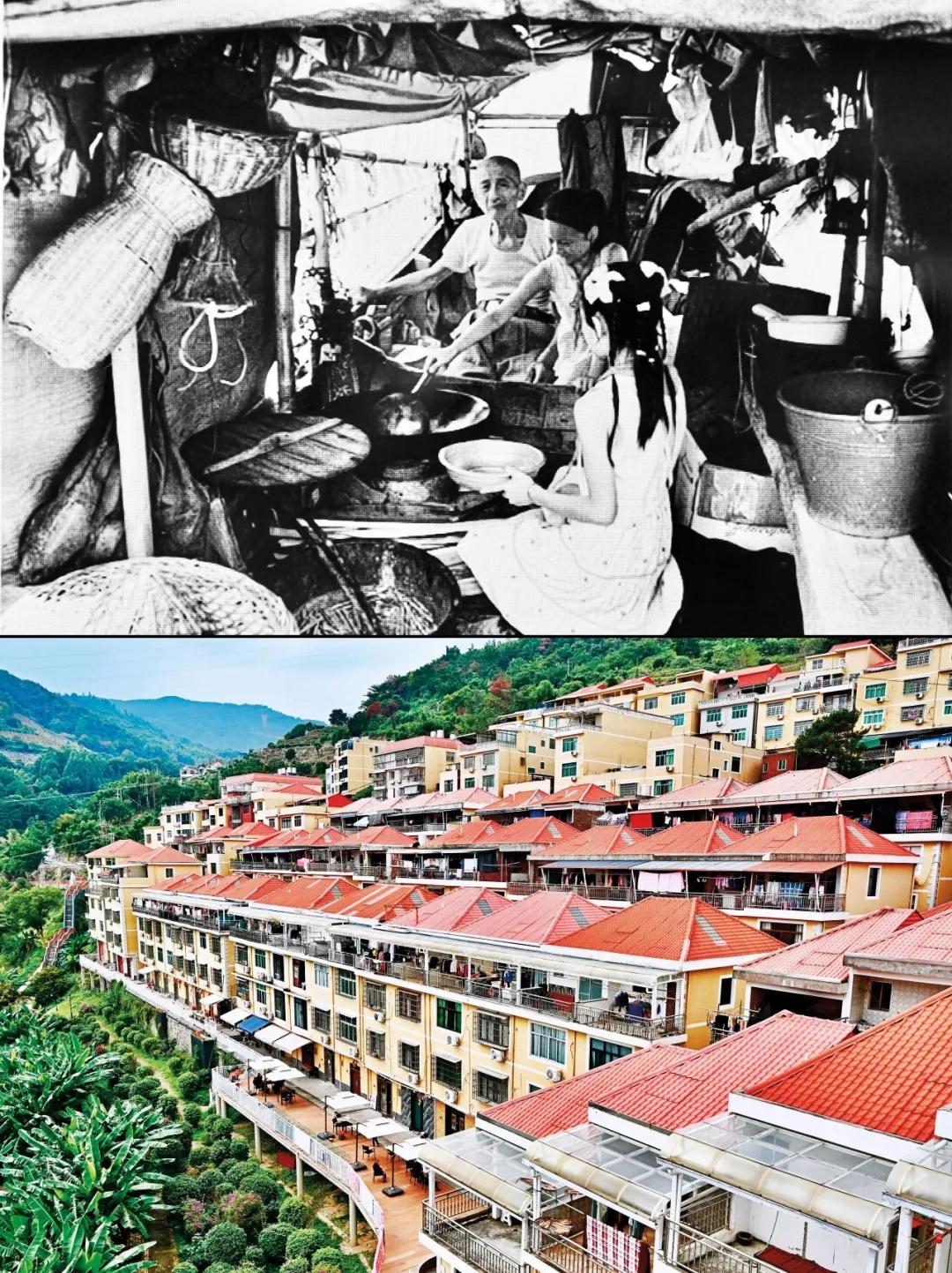 在福建省寧德市福安市下岐村,歷史上,村民祖祖輩輩以在淺海灘涂“討小?!睘樯?,一條小木船就是幾代人的家,生活條件異常艱苦,被稱為“連家船民”。20世紀(jì)90年代,福建“造福工程”啟動,下岐村采取“分期分批,全面搬遷”的辦法,將2000多名漁民安置上岸。如今的下岐村,成排的小洋樓矗立,漁民廣場、白馬公園等休閑設(shè)施一應(yīng)俱全,呈現(xiàn)出一幅百姓安居樂業(yè)的現(xiàn)代鄉(xiāng)村圖景。圖為拼版照片:上圖為20世紀(jì)80年代福建寧德地區(qū)的連家船民生活場景(資料照片);下圖為2023年11月15日拍攝的下岐村(新華社記者 姜克紅/攝)。 新華社發(fā)