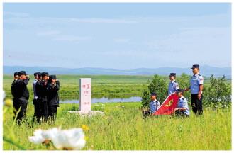 圖為內(nèi)蒙古自治區(qū)呼倫貝爾邊境管理支隊(duì)額爾古納邊境管理大隊(duì)室韋邊境派出所民警和護(hù)邊員在110號(hào)界碑旁重溫入黨誓詞。 李永建 攝