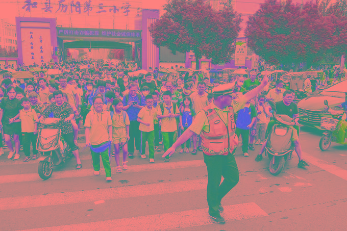 圖①:9月1日,安徽省和縣公安局交警大隊輔警護送學(xué)生過馬路。秦祖泉 攝