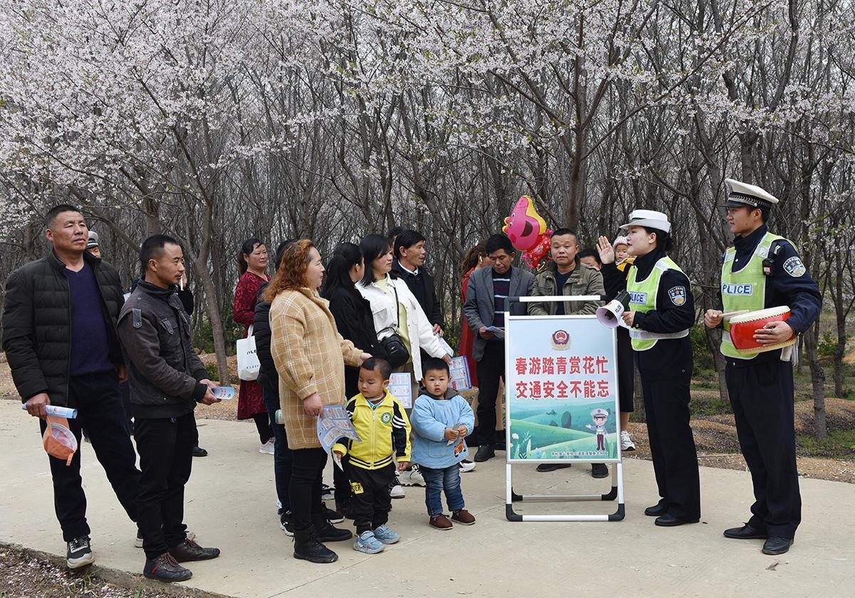 3月29日,安徽省安慶市宿松縣公安局交警大隊民輔警深入轄區(qū)櫻花園等景點,對自駕游游客開展交通安全提示,發(fā)放安全提示卡。圖為該大隊民輔警采取交通安全“大鼓書”的形式宣傳旅游交通安全常識。
