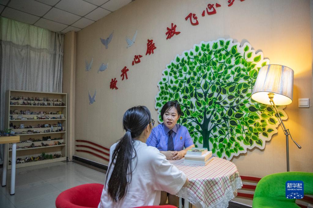 9月20日,在重慶市大渡口區(qū)人民檢察院“莎姐”談心室內(nèi),梅玫與一名前來咨詢的未成年人談心。新華社記者 黃偉 攝
