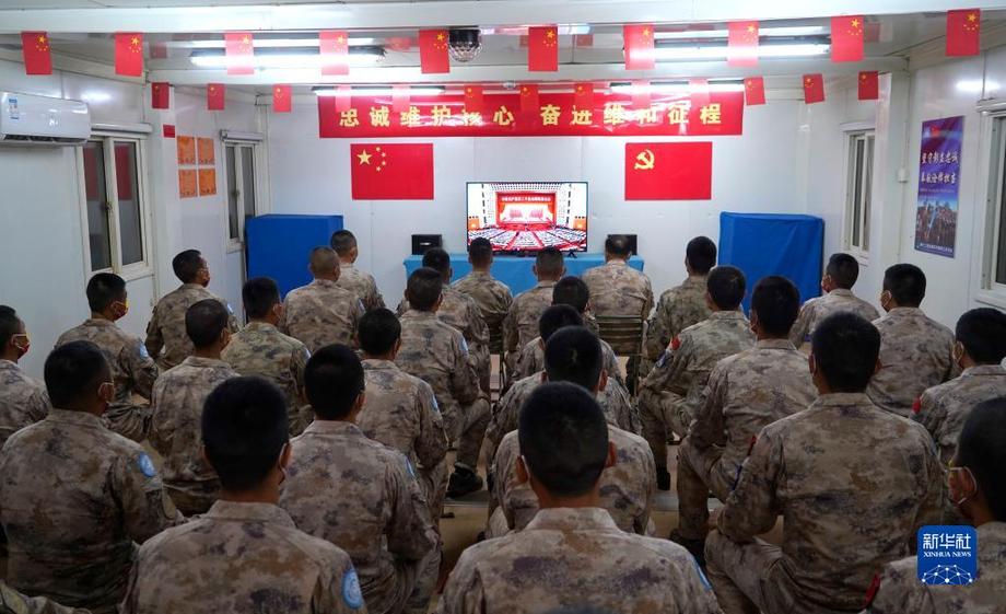 10月16日,中國(guó)第十二批赴南蘇丹(瓦烏)維和工兵分隊(duì)官兵收看中國(guó)共產(chǎn)黨第二十次全國(guó)代表大會(huì)開幕會(huì)。新華社(張益瑋 攝)