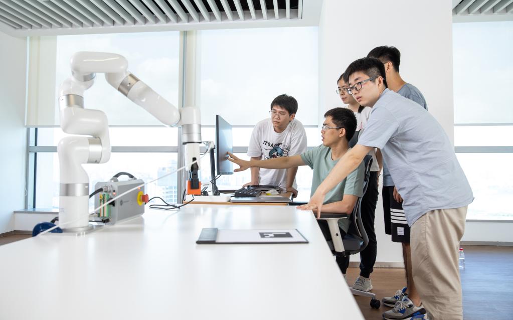 圖為吳翼(左三)及其團(tuán)隊正在開展可泛化的機(jī)械臂控制相關(guān)科研工作。