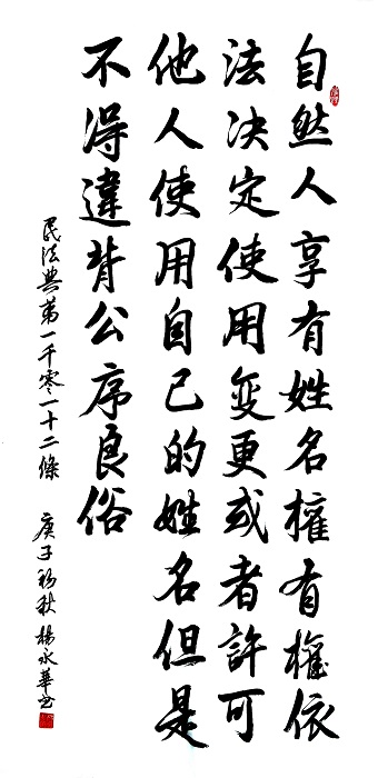 民法典第一千零一十二條 自然人享有姓名權,有權依法決定、使用、變更或者許可他人使用自己的姓名,但是不得違背公序良俗。