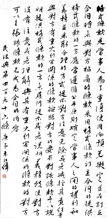 民法典第四百九十六條 格式條款是當(dāng)事人為了重復(fù)使用而預(yù)先擬定,并在訂立合同時(shí)未與對(duì)方協(xié)商的條款。
