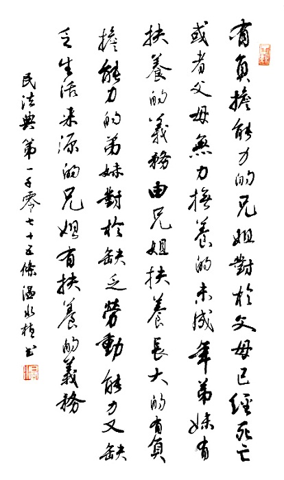 民法典第一千零七十五條 有負(fù)擔(dān)能力的兄、姐,對(duì)于父母已經(jīng)死亡或者父母無力撫養(yǎng)的未成年弟、妹,有扶養(yǎng)的義務(wù)。