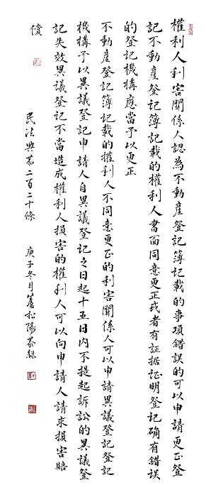 民法典第二百二十條 權(quán)利人、利害關(guān)系人認(rèn)為不動(dòng)產(chǎn)登記簿記載的事項(xiàng)錯(cuò)誤的,可以申請(qǐng)更正登記。不動(dòng)產(chǎn)登記簿記載的權(quán)利人書(shū)面同意更正或者有證據(jù)證明登記確有錯(cuò)誤的,登記機(jī)構(gòu)應(yīng)當(dāng)予以更正。