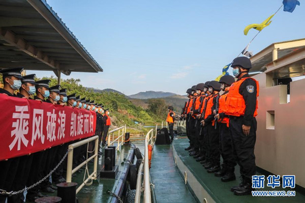 2月23日,參巡隊(duì)員在執(zhí)法艇上列隊(duì)站坡與岸上歡送的民警告別?! ⌒氯A社發(fā)(趙越 攝)