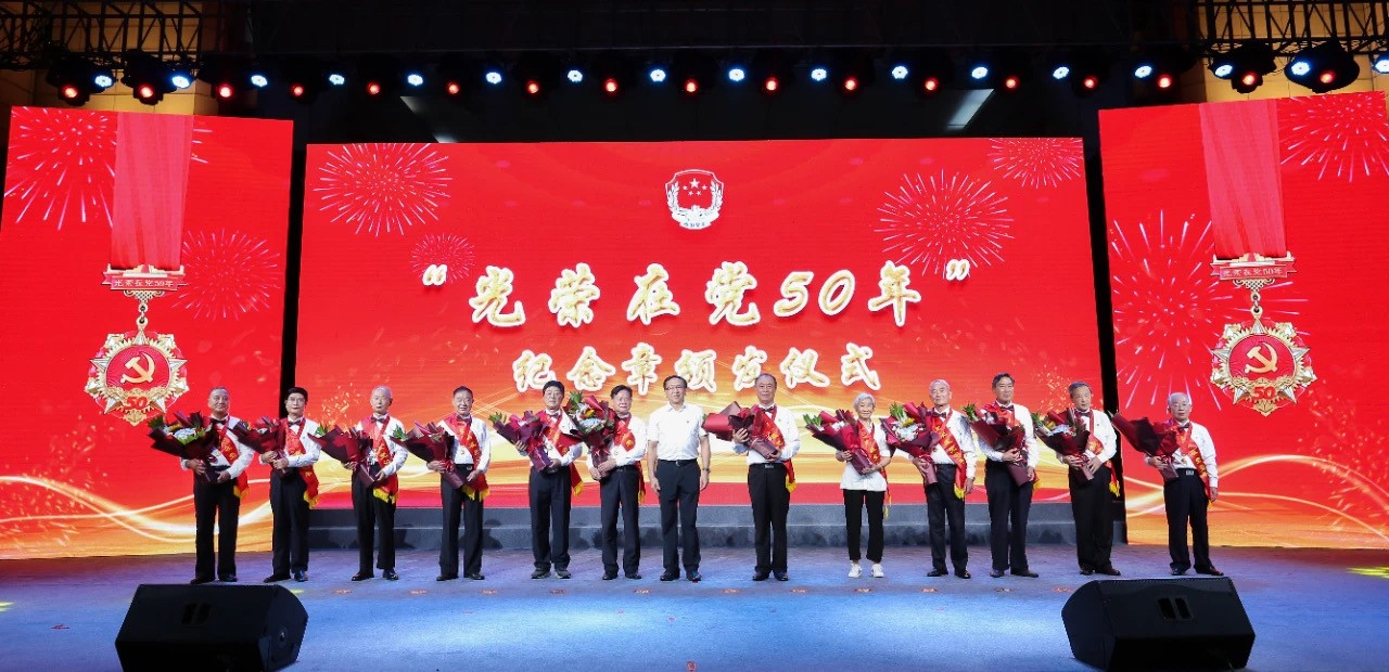 ▲江西省委常委、政法委書記尹建業(yè)為“光榮在黨50年”紀(jì)念章獲得者代表頒發(fā)紀(jì)念章