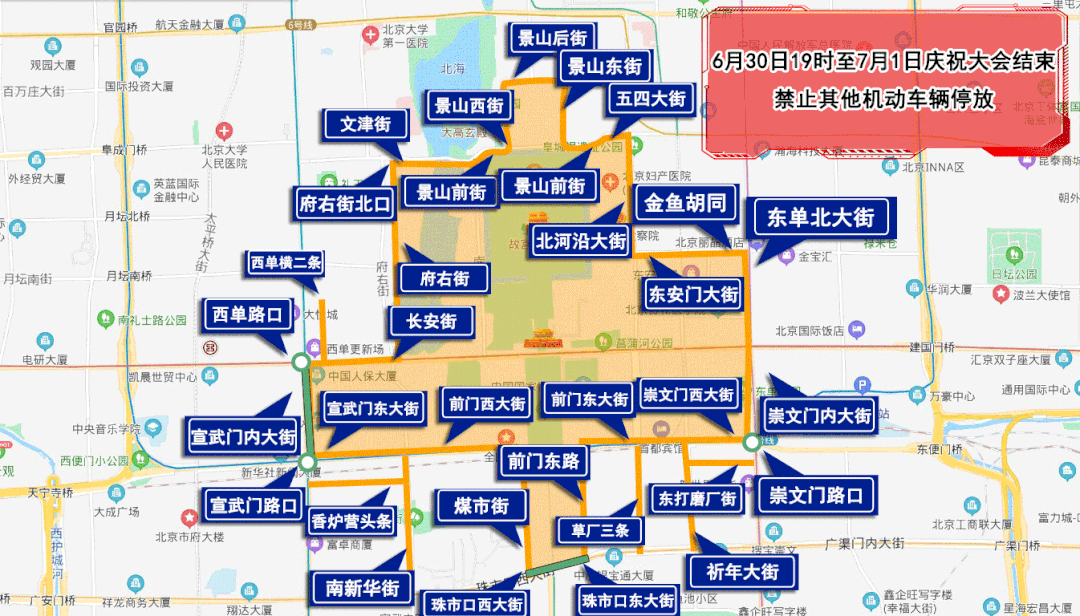 6月30日19時至7月1日慶祝大會結束,由府右街北口經(jīng)府右街、長安街、西單路口(不含)、宣武門內大街(不含)、宣武門路口(不含)、宣武門東大街、前門西大街、煤市街、珠市口西大街(不含)、珠市口東大街(不含)、前門東路、前門東大街、崇文門西大街、崇文門路口(不含)、崇文門內大街、東單北大街、金魚胡同、東安門大街、北河沿大街、五四大街、景山前街、景山東街、景山后街、景山西街、景山前街、文津街至府右街北口以內區(qū)域、西單橫二條、祈年大街、東打磨廠街、南新華街、香爐營頭條、草廠三條、前門肯德基停車場,除持有慶祝大會專用證件的車輛外,禁止其他機動車輛停放。