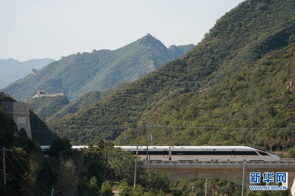 一列復(fù)興號(hào)高鐵列車從京張高鐵駛過(guò)居庸關(guān)長(zhǎng)城(2020年10月6日攝)。新華社記者 鞠煥宗 攝