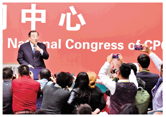 2017年10月19日,中國共產(chǎn)黨第十九次全國代表大會舉行記者招待會,請時任中央紀委副書記、監(jiān)察部部長、國家預防腐敗局局長楊曉渡等介紹加強黨建工作和全面從嚴治黨,堅定不移推進依規(guī)治黨,建設完善黨內(nèi)法規(guī)體系的情況。李鑫 攝
