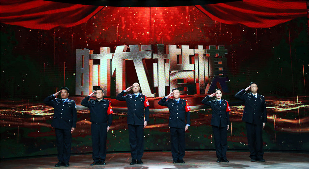 福建省“漳州110”成員代表在“時(shí)代楷?!卑l(fā)布儀式上敬禮(1月4日攝)?!罢闹?10”是人民群眾對(duì)福建省漳州市公安局巡特警支隊(duì)直屬大隊(duì)的簡(jiǎn)稱。自1990年8月成立以來,這個(gè)代號(hào)守護(hù)了當(dāng)?shù)匕傩?0余年。新華社記者 潘旭 攝