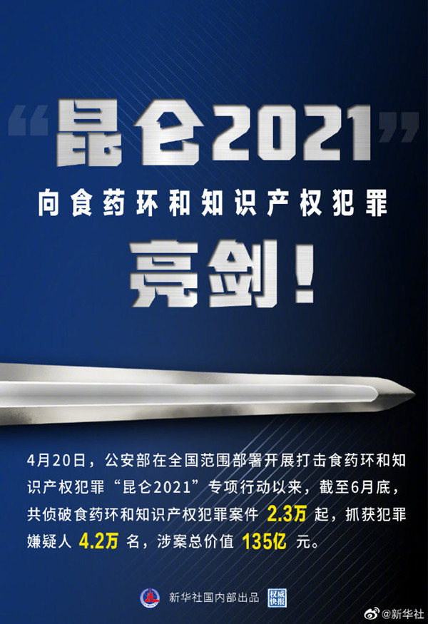 呵護(hù)“舌尖上的安全”、保障醫(yī)療用藥安全、打擊侵權(quán)假冒犯罪、打擊破壞生態(tài)環(huán)境犯罪……公安部29日召開新聞發(fā)布會介紹,公安部4月20日在全國范圍部署開展打擊食藥環(huán)和知識產(chǎn)權(quán)犯罪“昆侖2021”專項行動以來,截至6月底,共偵破食藥環(huán)和知識產(chǎn)權(quán)犯罪案件2.3萬起,抓獲犯罪嫌疑人4.2萬名,涉案總價值135億元。(記者熊豐,海報設(shè)計賈伊寧)
