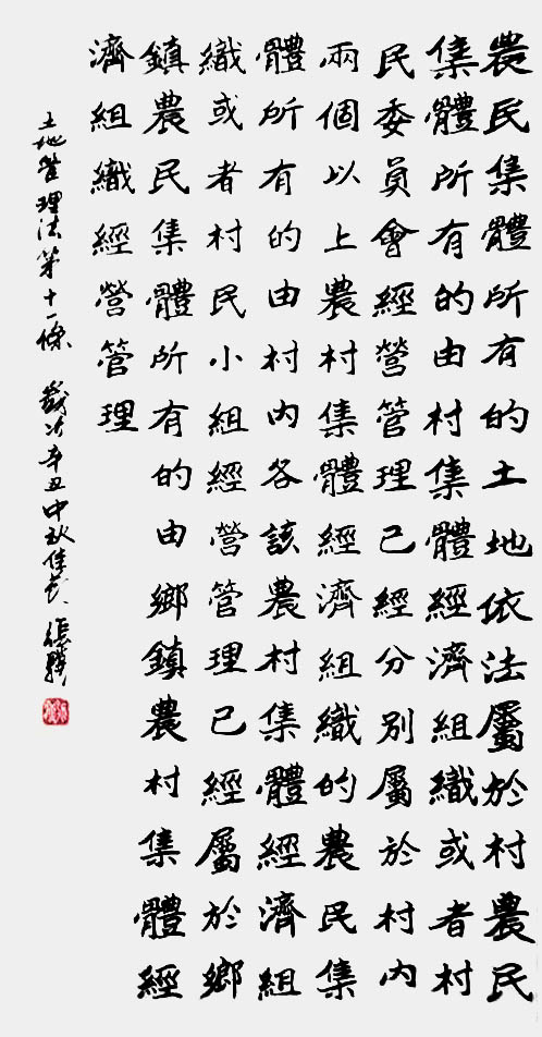 繼1600余位書法家參與書寫《中華人民共和國民法典》全部1260條法條之后,法治日報社聯(lián)合自然資源部法規(guī)司、自然資源部書畫研究會和北京昌平書法家協(xié)會,將筆端對準(zhǔn)土地管理“一法一條例”,即《中華人民共和國土地管理法》和《中華人民共和國土地管理法實(shí)施條例》。