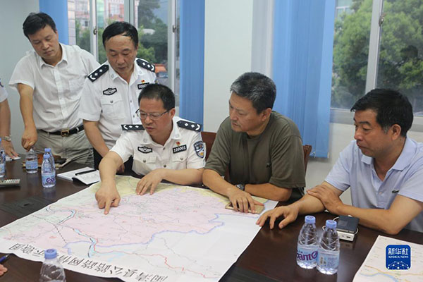 潘東升(中)在閩清指導(dǎo)防抗臺風(fēng)“尼伯特”(2016年7月12日攝)。新華社發(fā)(福州市公安局供圖)