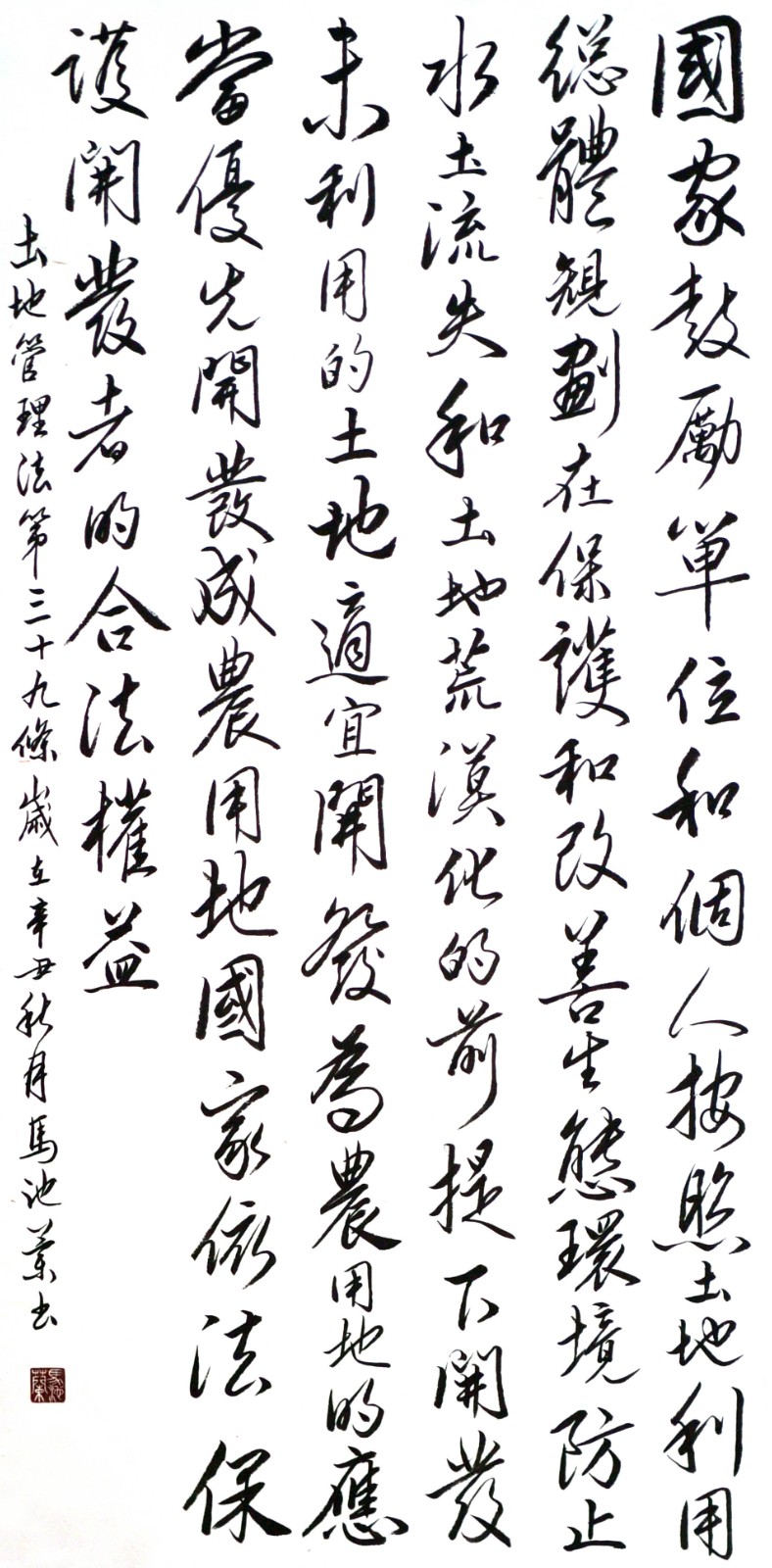 繼1600余位書(shū)法家參與書(shū)寫(xiě)《中華人民共和國(guó)民法典》全部1260條法條之后,法治日?qǐng)?bào)社聯(lián)合自然資源部法規(guī)司、自然資源部書(shū)畫(huà)研究會(huì)和北京昌平書(shū)法家協(xié)會(huì),將筆端對(duì)準(zhǔn)土地管理“一法一條例”,即《中華人民共和國(guó)土地管理法》和《中華人民共和國(guó)土地管理法實(shí)施條例》。