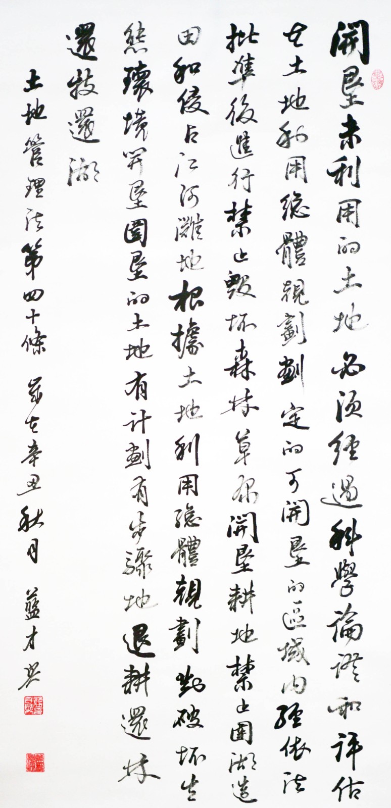 繼1600余位書(shū)法家參與書(shū)寫(xiě)《中華人民共和國(guó)民法典》全部1260條法條之后,法治日?qǐng)?bào)社聯(lián)合自然資源部法規(guī)司、自然資源部書(shū)畫(huà)研究會(huì)和北京昌平書(shū)法家協(xié)會(huì),將筆端對(duì)準(zhǔn)土地管理“一法一條例”,即《中華人民共和國(guó)土地管理法》和《中華人民共和國(guó)土地管理法實(shí)施條例》。