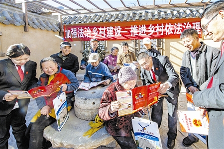 11月30日上午,在第8個(gè)國(guó)家憲法日來(lái)臨之際,全國(guó)模范法官、山西省左權(quán)縣人民法院副院長(zhǎng)楊春光(右三)帶領(lǐng)法院干警深入半坡村、澤城村,為群眾發(fā)放《憲法宣傳手冊(cè)》《民法典》《訴訟服務(wù)指南》等普法材料,耐心解答群眾疑惑。畢浩、翟宏巖 攝