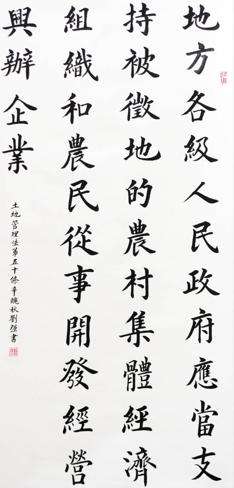 繼1600余位書法家參與書寫《中華人民共和國民法典》全部1260條法條之后,法治日報(bào)社聯(lián)合自然資源部法規(guī)司、自然資源部書畫研究會和北京昌平書法家協(xié)會,將筆端對準(zhǔn)土地管理“一法一條例”,即《中華人民共和國土地管理法》和《中華人民共和國土地管理法實(shí)施條例》。