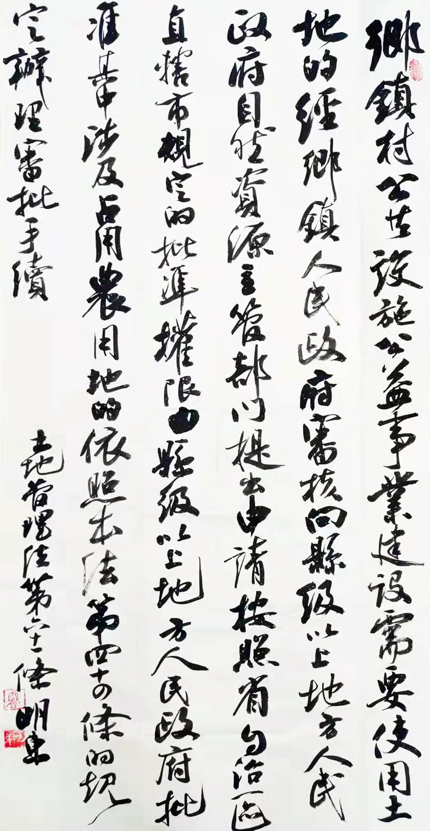 繼1600余位書法家參與書寫《中華人民共和國民法典》全部1260條法條之后,法治日報社聯(lián)合自然資源部法規(guī)司、自然資源部書畫研究會和北京昌平書法家協(xié)會,將筆端對準土地管理“一法一條例”,即《中華人民共和國土地管理法》和《中華人民共和國土地管理法實施條例》。