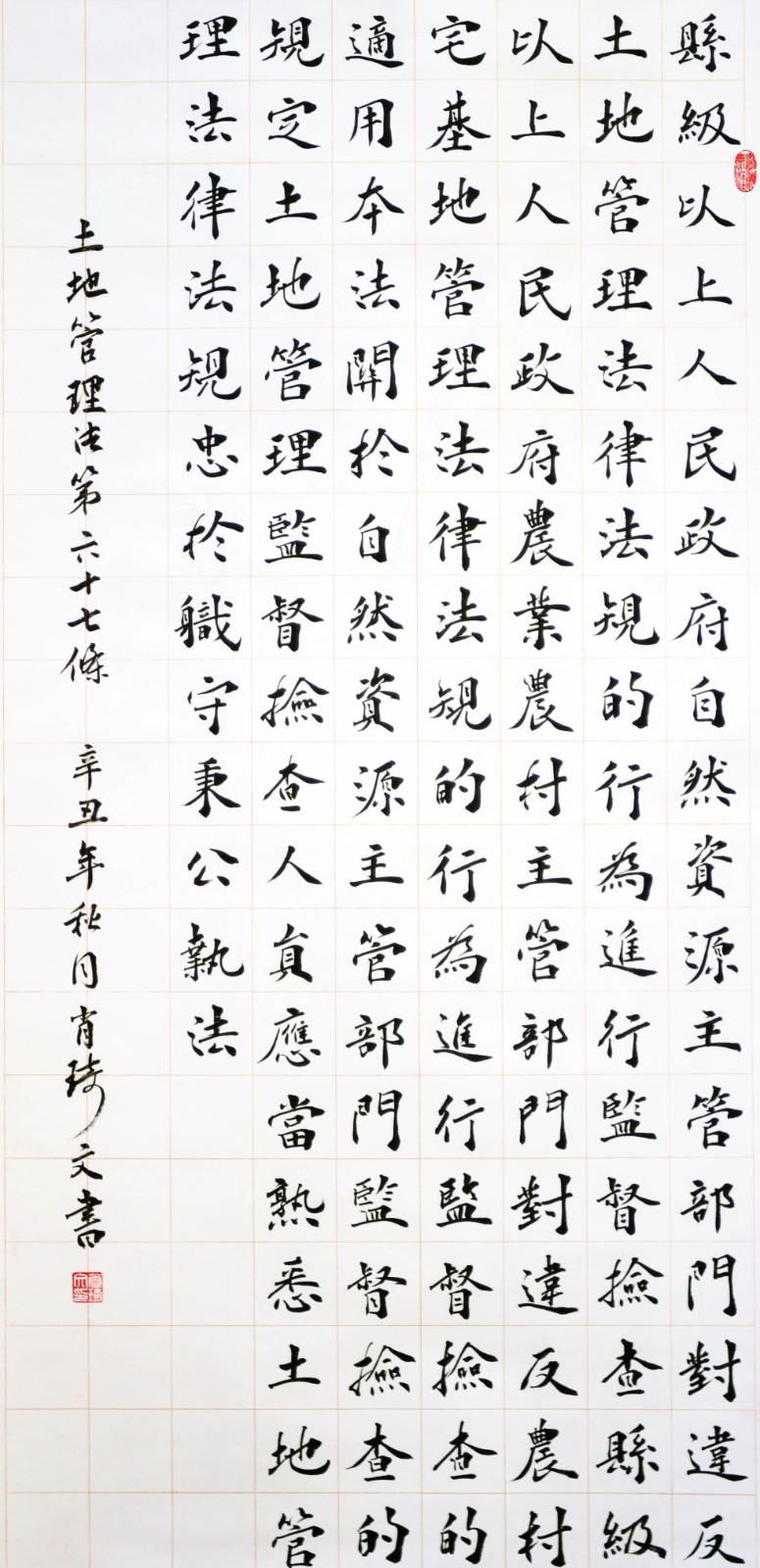 繼1600余位書法家參與書寫《中華人民共和國民法典》全部1260條法條之后,法治日報(bào)社聯(lián)合自然資源部法規(guī)司、自然資源部書畫研究會和北京昌平書法家協(xié)會,將筆端對準(zhǔn)土地管理“一法一條例”,即《中華人民共和國土地管理法》和《中華人民共和國土地管理法實(shí)施條例》。
