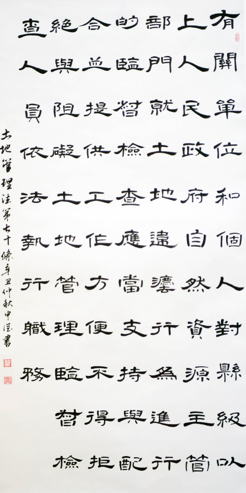 繼1600余位書法家參與書寫《中華人民共和國民法典》全部1260條法條之后,法治日報社聯(lián)合自然資源部法規(guī)司、自然資源部書畫研究會和北京昌平書法家協(xié)會,將筆端對準土地管理“一法一條例”,即《中華人民共和國土地管理法》和《中華人民共和國土地管理法實施條例》。