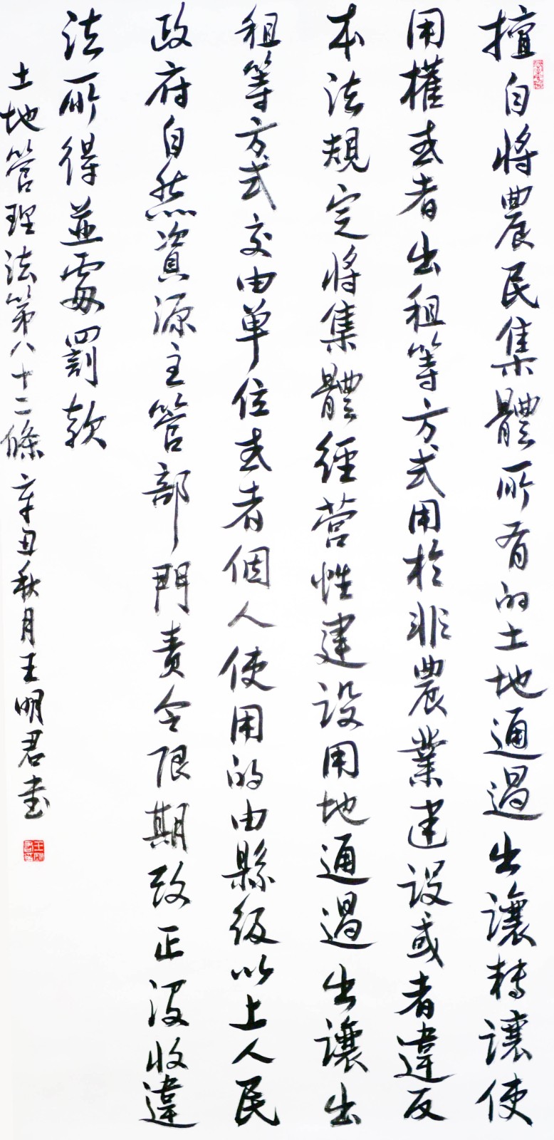 繼1600余位書法家參與書寫《中華人民共和國民法典》全部1260條法條之后,法治日報社聯(lián)合自然資源部法規(guī)司、自然資源部書畫研究會和北京昌平書法家協(xié)會,將筆端對準土地管理“一法一條例”,即《中華人民共和國土地管理法》和《中華人民共和國土地管理法實施條例》。