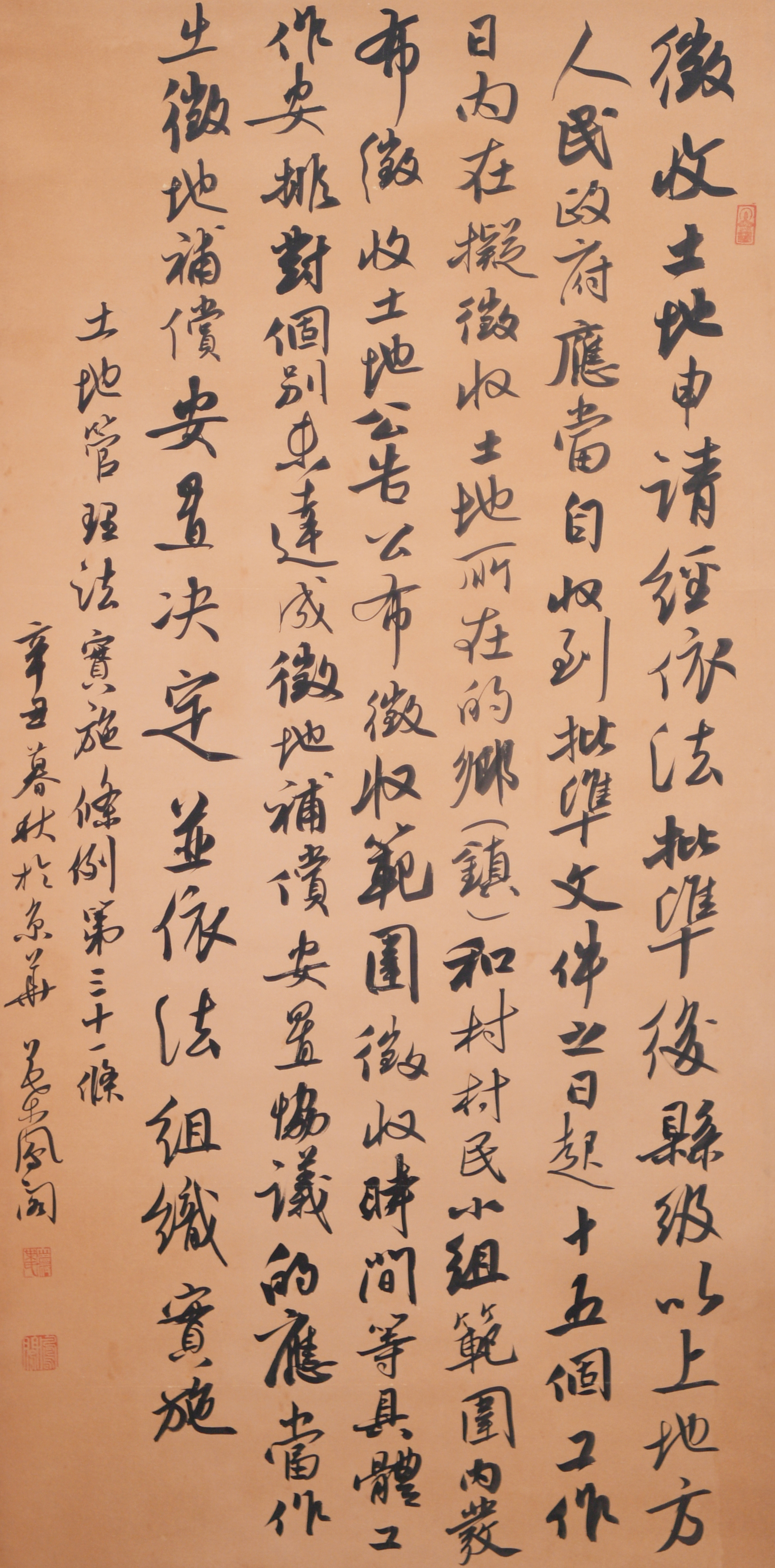 繼1600余位書法家參與書寫《中華人民共和國民法典》全部1260條法條之后,法治日報(bào)社聯(lián)合自然資源部法規(guī)司、自然資源部書畫研究會和北京昌平書法家協(xié)會,將筆端對準(zhǔn)土地管理“一法一條例”,即《中華人民共和國土地管理法》和《中華人民共和國土地管理法實(shí)施條例》。