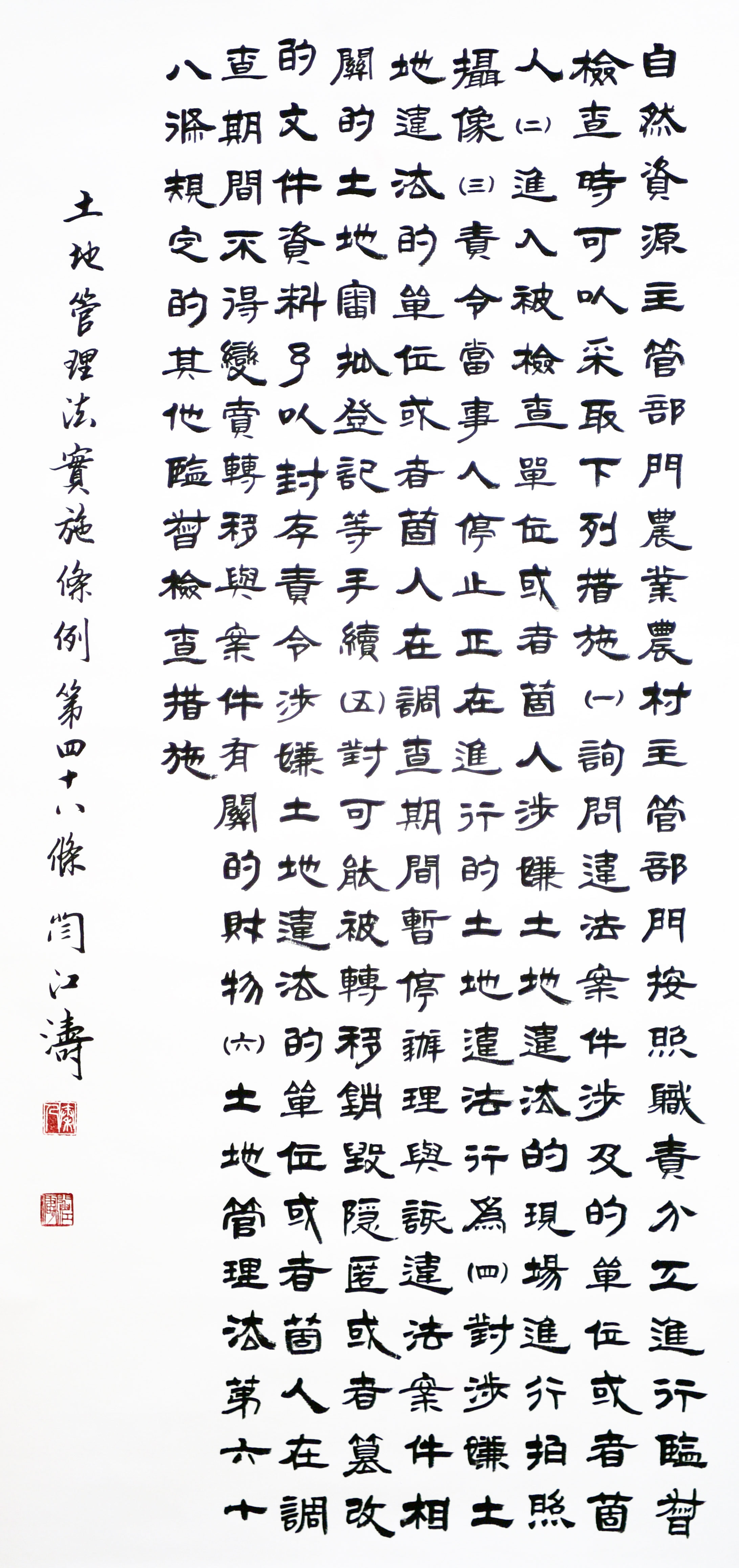 繼1600余位書法家參與書寫《中華人民共和國(guó)民法典》全部1260條法條之后,法治日?qǐng)?bào)社聯(lián)合自然資源部法規(guī)司、自然資源部書畫研究會(huì)和北京昌平書法家協(xié)會(huì),將筆端對(duì)準(zhǔn)土地管理“一法一條例”,即《中華人民共和國(guó)土地管理法》和《中華人民共和國(guó)土地管理法實(shí)施條例》。