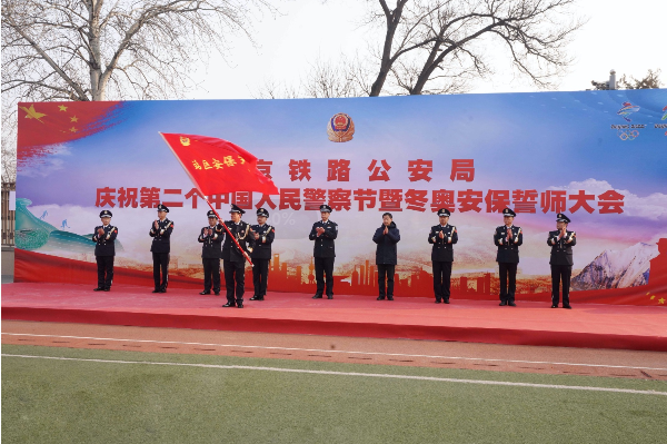 “我是中國人民警察,我宣誓.......”在北京鐵路公安局黨委書記、局長王旭章帶領下,110名干部民警代表組成“110”隊形,面向警旗,莊嚴宣誓,慶祝自己的節(jié)日。在隨后進行的北京鐵路公安局冬奧安保誓師大會上,王旭章又分別為“黨員干部先鋒隊”“站區(qū)安保突擊隊”“線路防控突擊隊”“應急處置突擊隊”和“賽時運送護衛(wèi)隊”五支冬奧安保維穩(wěn)專業(yè)隊授旗,并代表北京鐵路公安局黨委莊重承諾:北京鐵路公安機關全體干部民警將以鐵路冬奧安保“主場、主責、主戰(zhàn)、主力”的政治站位和責任擔當,以“主戰(zhàn)用我,用我必勝”的戰(zhàn)斗意志和積極勇為,忠誠履責、踐行使命,堅決確保轄區(qū)的絕對安全,在北京冬奧盛會中,展現(xiàn)北京鐵警風采,奉獻忠誠與作為!