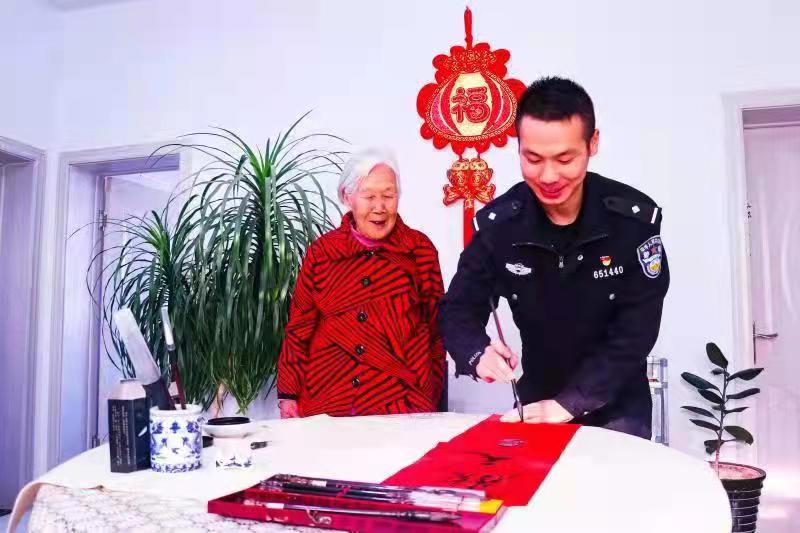 活動中,派出所民警李鵬翔、楊文龍到轄區(qū)孤寡、獨居和生活困難的群眾家中,親手書寫春聯(lián),幫助群眾掛上中國結(jié)和紅燈籠,并送去米、面、油、牛奶等慰問品表達節(jié)日的問候與祝福。期間,民警們特別登門拜訪了轄區(qū)75歲的抗美援朝老戰(zhàn)士李大娘家,為其送上春聯(lián),并聽李大娘講述抗美援朝故事,傳承擁軍愛民的光榮傳統(tǒng)。