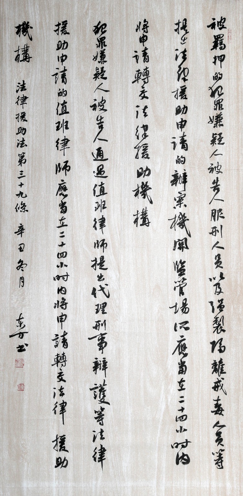 法律援助法第三十九條 被羈押的犯罪嫌疑人、被告人、服刑人員,以及強(qiáng)制隔離戒毒人員等提出法律援助申請(qǐng)的,辦案機(jī)關(guān)、監(jiān)管場(chǎng)所應(yīng)當(dāng)在二十四小時(shí)內(nèi)將申請(qǐng)轉(zhuǎn)交法律援助機(jī)構(gòu)。