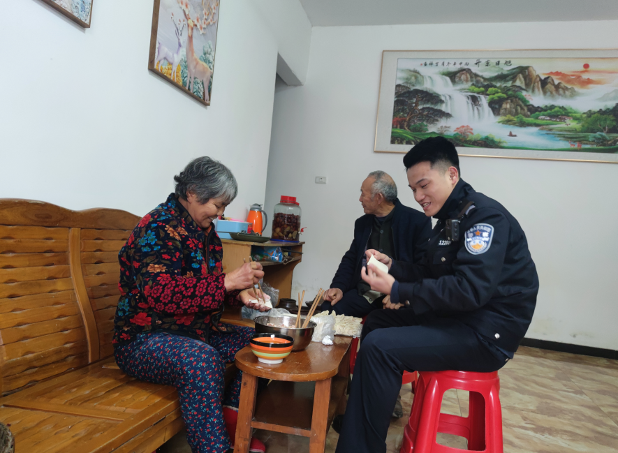 當(dāng)天上午,陳柳和輔警王強(qiáng)一起到天險(xiǎn)洞村六組劉得明家走訪。看到劉得明老伴正在包餃子,陳柳趕緊洗洗手坐下來(lái)幫忙。