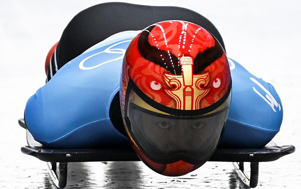 2月10日,中國選手殷正在北京冬奧會男子鋼架雪車項(xiàng)目比賽中。新華社記者賀長山攝