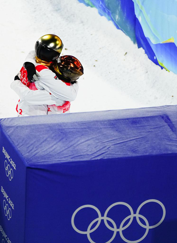 2月10日,中國(guó)隊(duì)選手徐夢(mèng)桃(右)和賈宗洋在北京2022年冬奧會(huì)自由式滑雪空中技巧混合團(tuán)體決賽比賽后擁抱。新華社記者許暢攝